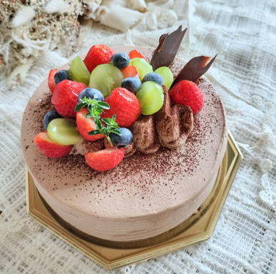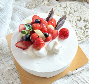 まるいデコレーションに ハート型しぼり (フルーツは季節によって変わります。いちご以外のベリー系はご用意が難しい場合があります) |